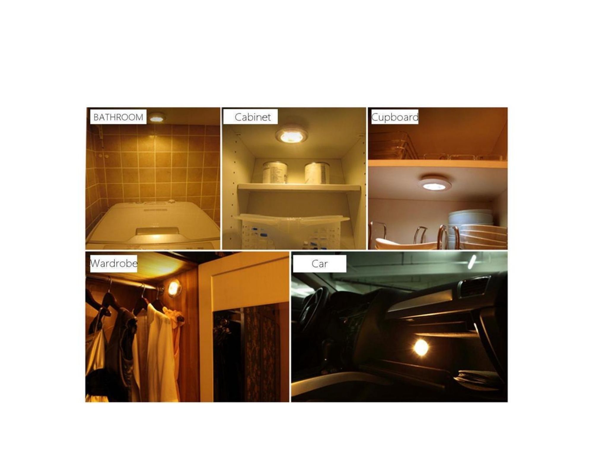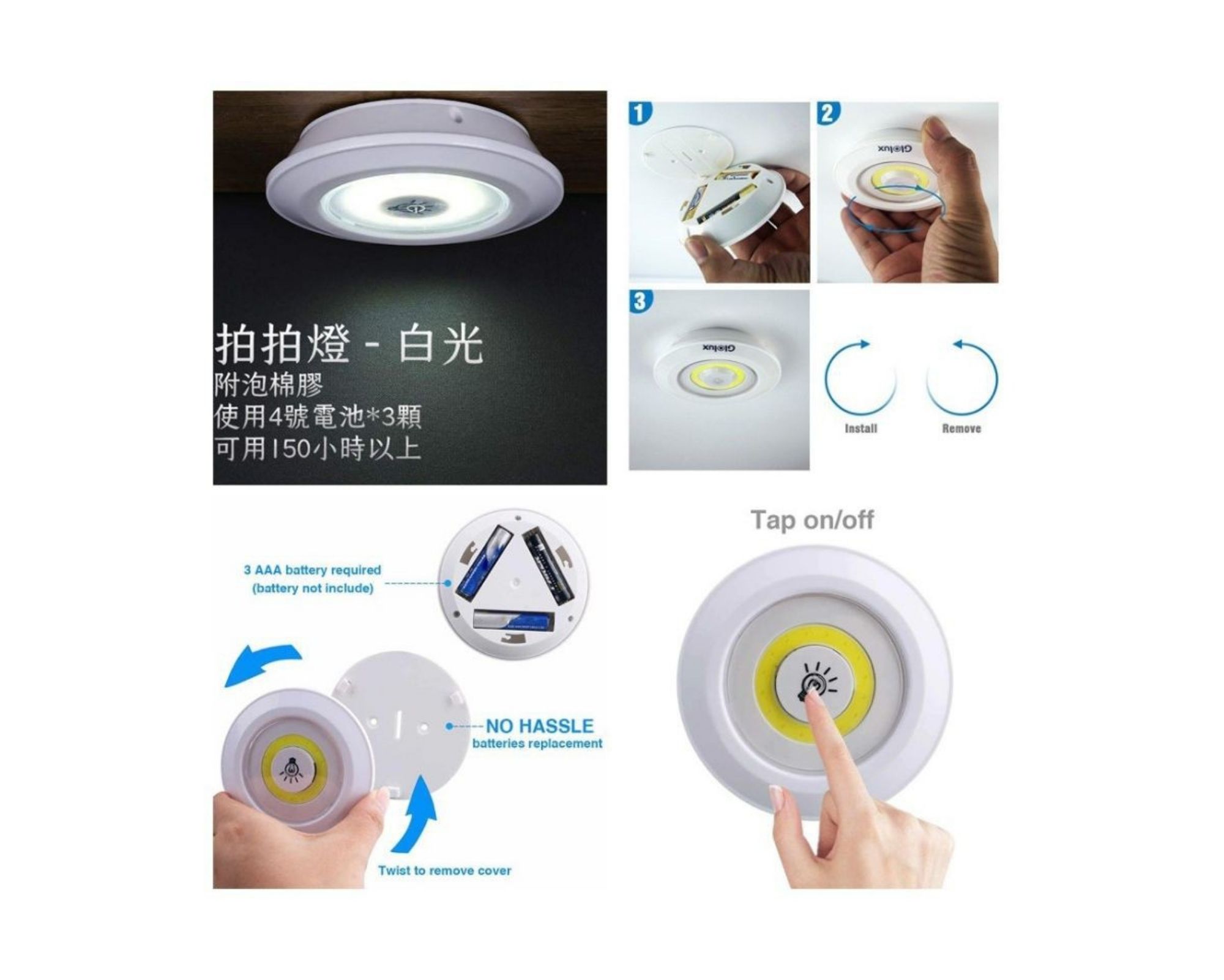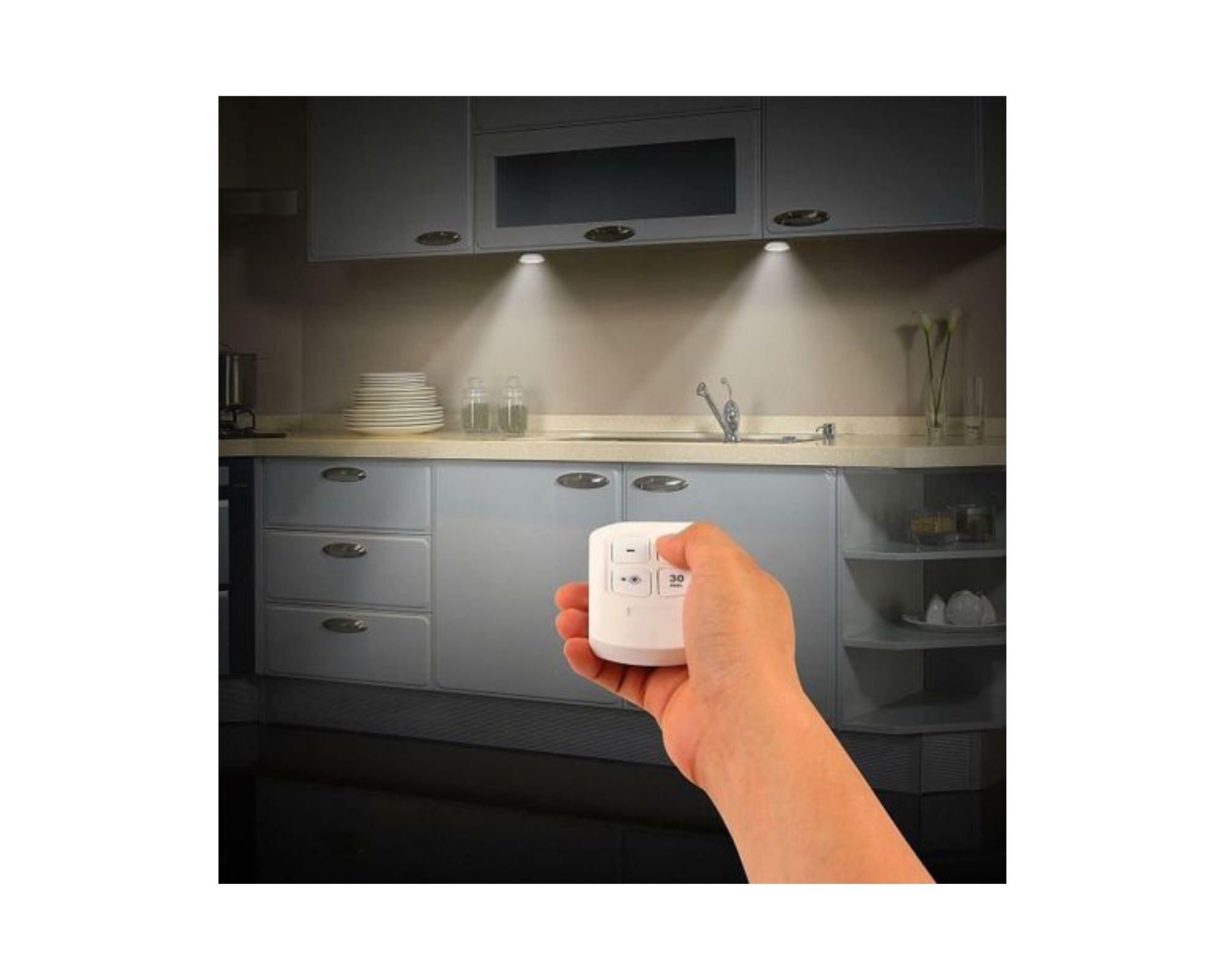 - Pas de problème d’installation – installez-les sur n’importe quelle surface à l’aide des autocollants fournis. L’appareil peut être contrôlé à l’aide d’une télécommande (marche/arrêt, variateur de lumière, minuterie 30 min.) ou en appuyant sur l’appareil lui-même.