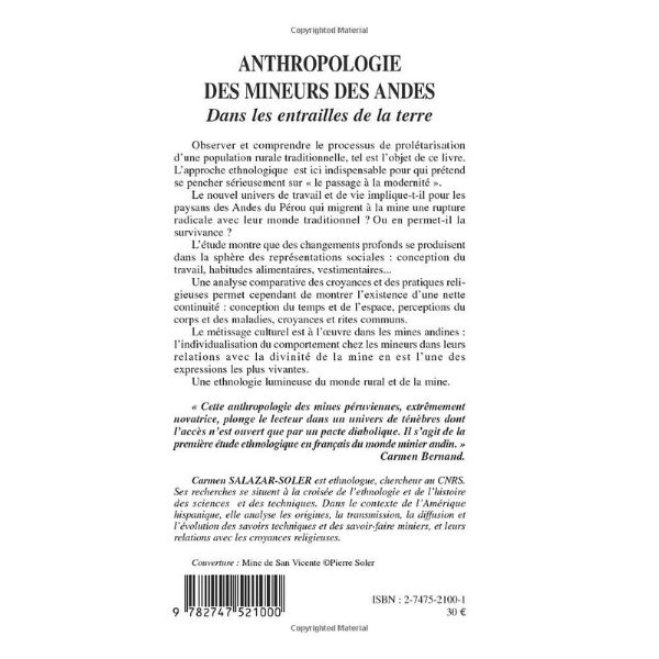 - Il s’agit ici d’observer et de comprendre le processus de prolétarisation d’une population rurale traditionnelle, par le biais d’une approche ethnologique qui seule permet de rendre compte du » passage à la modernité « . Le nouvel univers de travail et de vie implique-t-il pour les paysans des Andes du Pérou qui migrent à la mine une rupture radicale avec leur monde traditionnel, ou en permet-il au contraire la survivance ? Une ethnologie lumineuse du monde rural et de la mine.