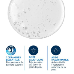 - Développée avec des dermatologues, cette formule lissante sans grains, aux 3 céramides essentiels, à l’acide salicylique et à l’acide hyaluronique, nettoie en douceur et favorise l’élimination des rugosités des peaux sèches sans altérer la barrière protectrice de la peau.