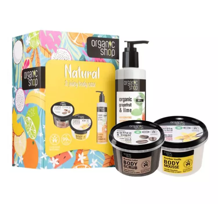 In the Organic Shop Natural & Juicy Body Care gift set you will find: nourishing Grapefruit Punch shower gel, cleansing Brazilian coffee body peeling and rejuvenating Vanilla Bourbon body peeling.