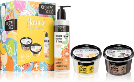 Dans le coffret Organic Shop Natural & Juicy Body Care, vous trouverez : un gel douche nourrissant Grapefruit Punch, un gommage corporel nettoyant au café brésilien et un gommage corporel rajeunissant à la vanille Bourbon.