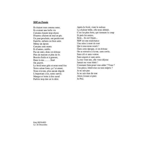 - Anciennement médiatrice sociale et culturelle, Katy RENARD propose une prise de conscience à la relativisation de nos vies ; en traitant de sujets comme :