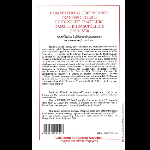 - A l’heure des trains à grande vitesse et des gares multimodales, cette étude historique autant que sociologique veut être un retour sur les origines du chemin de fer, en nous faisant découvrir la mise en place des premiers maillons de nos réseaux ferrés, le développement urbain généré par le rail et les conflits entre les différents acteurs. Dans le Rhin supérieur, l’histoire du développement industriel et urbain, du progrès technologique, l’histoire politique régionale, nationale et internationale, sont intimement liées à l’histoire de ces hommes, pionniers de leur époque, touchés par la fièvre ferroviaire et ses nouveaux enjeux.