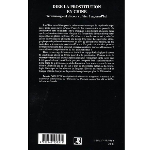 - Dans cet ouvrage, le lecteur est invité à un voyage lexicologique à travers le vocabulaire utilisé en Chine pour dire la prostitution. L’auteur tente de montrer comment ces traces linguistiques nous renseignent sur la façon dont le fait prostitutionnel est délimité, perçu et interprété dans la culture chinoise. Cette étude de la terminologie et du discours se base sur un corpus de termes riche et diversifié que ce soit sur le plan du phénomène même, de la chronologie historique et des niveaux de langue. Elle est en outre suivie d’un lexique chinois-français de la prostitution qui compte plus de 700 entrés…