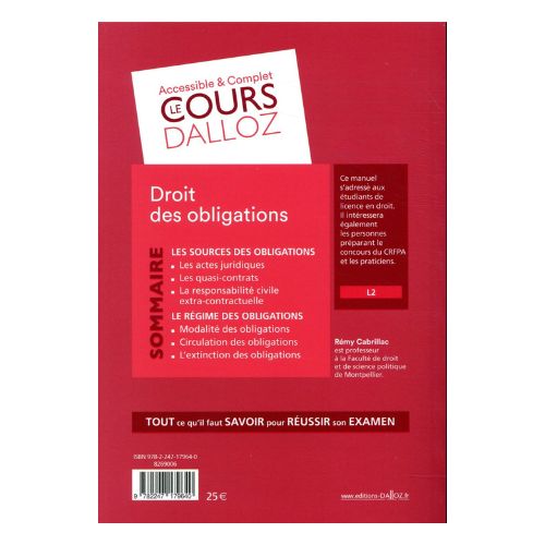 Ainsi enrichie, cette nouvelle édition devrait, comme les précédentes, être un outil efficace de connaissance et de perfectionnement en droit des obligations, efficace pour les étudiants de licence, ceux des autres filières qui étudient la matière (sciences économiques, AES, écoles de commerce), ceux qui préparent les concours, ou pour tous les professionnels qui souhaitent rafraîchir leurs connaissances