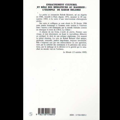 - Qu’est-ce que l’enracinement culturel ? Et sous quelle forme se manifeste-t-il dans l’écriture ou dans la pensée ? Peut-on considérer qu’un intellectuel » engagé » dans la lutte pour l’indépendance de son pays est par là même enraciné dans sa culture d’origine ? L’enracinement dans ce cas signifierait-il retour aux sources et en somme quête d’identité ? Hommage à Rabah Belamri cet ouvrage se propose de replacer le concept d’enracinement culturel dans ses divers contextes, en particulier politique, social et culturel.