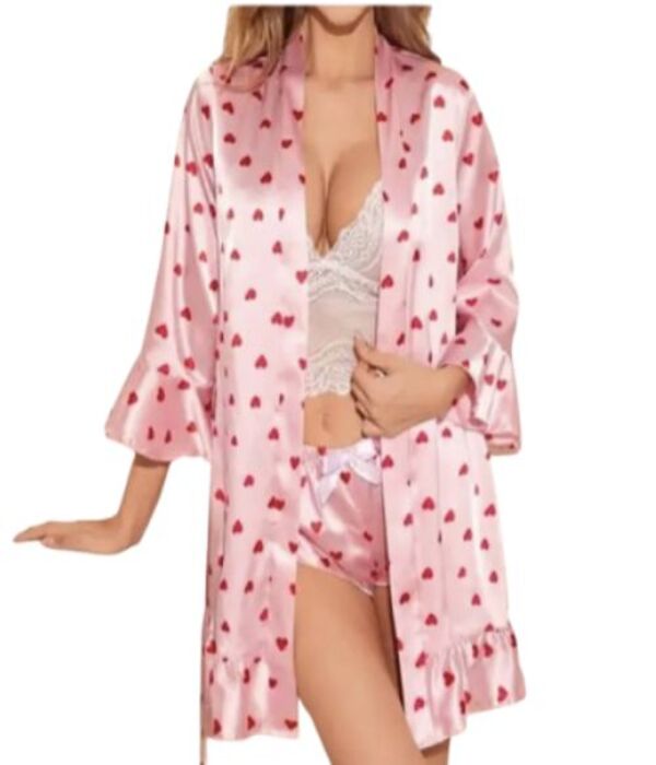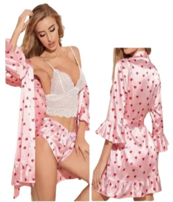 - This 3-piece pyjama and bathrobe set contains a sexy lace lingerie set, shorts and top, and a satin bathrobe