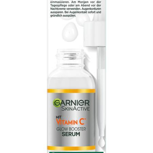 - Before using Garnier SkinActive Glow Booster Serum with vitamin C, thoroughly cleanse the face and remove dirt, product residues and excess sebum.