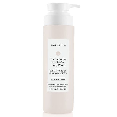 - Naturium Glycolic Acid Shower Gel exfoliates and smooths rough, grainy skin to reveal softer, smoother skin.