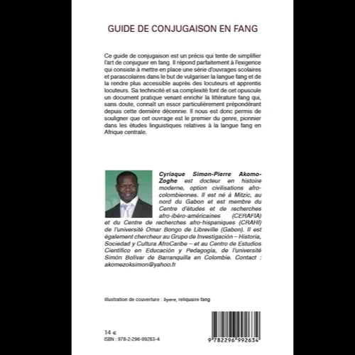 - Ce guide de conjugaison est un précis qui tente de simplifier l’art de conjuguer en fang. Il répond parfaitement à l’exigence qui consiste à mettre en place une série d’ouvrages scolaires et parascolaires dans le but de vulgariser la langue fang et de la rendre plus accessible auprès des locuteurs et apprentis locuteurs. Sa technicité et sa complexité font de cet opuscule un document pratique venant enrichir la littérature fang qui, sans doute, connaît un essor particulièrement prépondérant depuis cette dernière décennie. Il nous est donc permis de souligner que cet ouvrage est le premier du genre, pionnier dans les études linguistiques relatives à la langue fang en Afrique centrale.