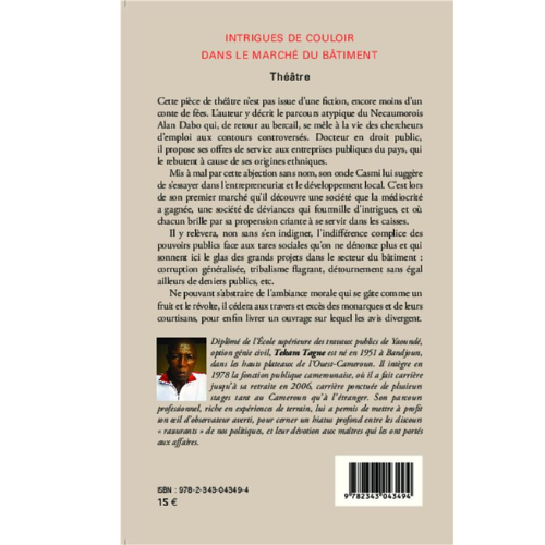 - Cette pièce décrit le parcours atypique du Necaumorois Alan Dabo, docteur en droit public, qui, de retour au bercail, se mêle à la vie des chercheurs d’emploi. Rebuté à cause de ses origines ethniques par les entreprises publiques du pays, son oncle Casmi lui suggère de s’essayer à l’entrepreneuriat et au développement local. Il y découvre une société que la médiocrité a gagnée, une société de déviances qui fourmille d’intrigues et où chacun brille de sa propension criante à se servir dans les caisses.