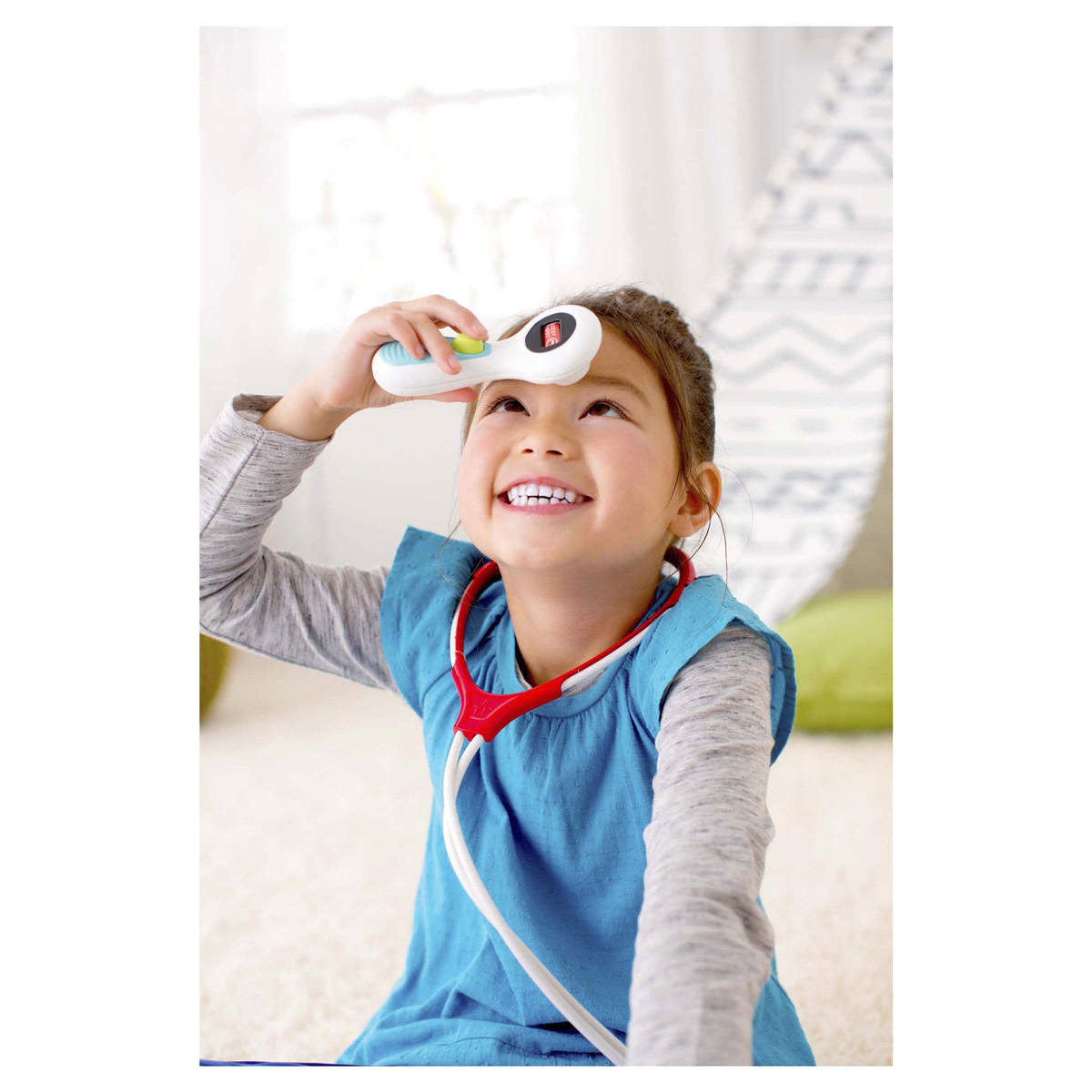 Le kit de jeu Comprend un stéthoscope, un brassard de tensiomètre, un thermomètre, un otoscope, une seringue, un brassard de bandage et un sac docteur en tissu.