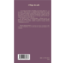 - L’intérieur bien rangé, on n’y croit pas pour soi et le très-clean effraie par son état trop vif. »Ni roman, ni essai, ni autobiographie, » L’Eloge du Sale » est plutôt une double parole : critique et acerbe sur notre monde hygiéniste et sans pitié, tendre et parfois lyrique devant l’exubérance de la vie. »