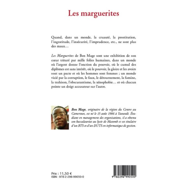 Les marguerites de Ben Mage sont une exhibition de son cœur trituré par mille folies humaines, dans un monde où l’argent donne l’onction du pouvoir, où le cumul des diplômes est sans intérêt, où le pouvoir, la gloire et les avoirs sont un pacte et où les hommes sont femmes ; un monde vicié par la corruption, le faux, le détournement, la famine, la trahison… et où chacun pointe un doigt accusateur sur l’autre.