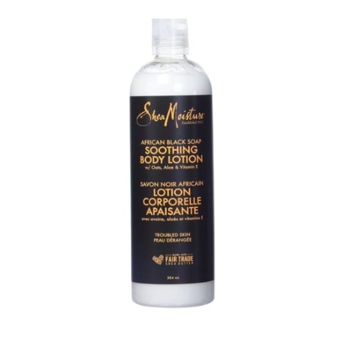 - Soothing body lotion with African black soap, oats, aloe vera and vitamin E for gentle treatment of dry skin.