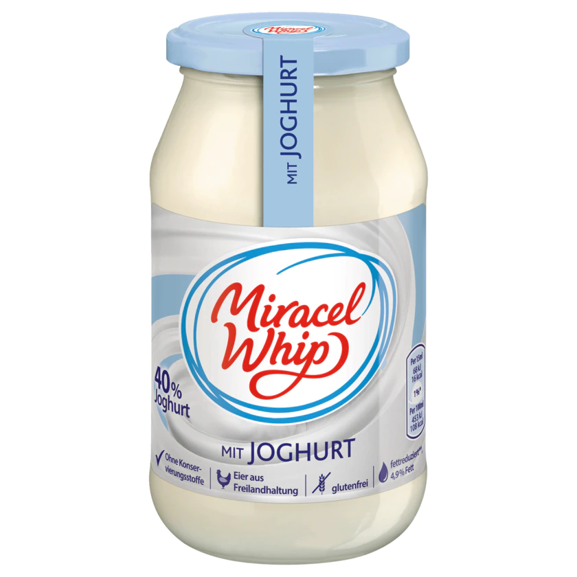 - Avec une proportion de 40 % de yaourt allégé, le Miracel Whip au yaourt a un goût particulièrement frais et donne à vos plats ce petit quelque chose en plus – avec seulement 4,9 % de matière grasse.