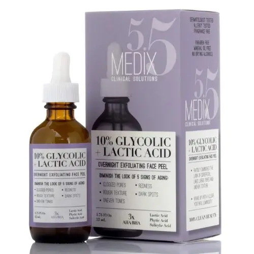 Medix 5.5 glycolic acid serum reduces the appearance of clogged pores, rough skin texture, uneven tone, redness and brown spots.