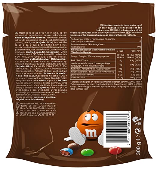 Ingrédients : sucre, arachides, pâte de cacao, poudre de lait écrémé, lactose et protéines de lait, beurre de cacao, graisse de palme, matière grasse butyrique (du lait), amidon, sirop de glucose, lactose, graisse de karité, stabilisant (gomme arabique), émulsifiant (lécithine de soja), colorants (E100, E120, E133, E160a, E160e, E171), dextrine, agent d’enrobage (cire de carnauba), huile de coco, sel, arômes. (Peut contenir : noisettes, amandes).