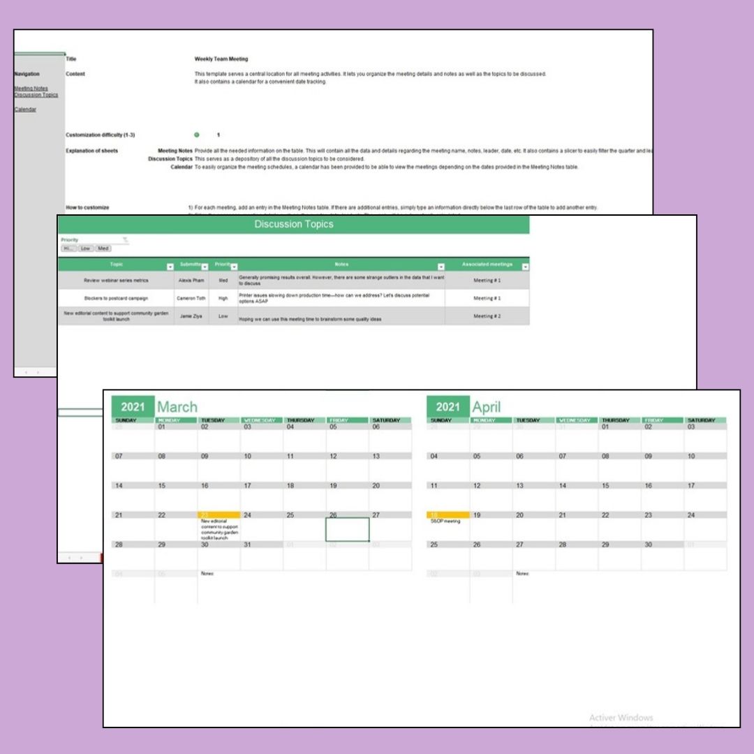 Suivez et enregistrez les réunions d’équipe, les événements et les notes. Pré-construit avec des formules dynamiques, un calendrier et des filtres pour l’organisation.