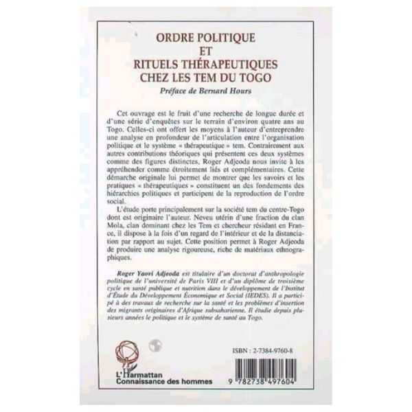 - Cet ouvrage est le fruit d’une série d’enquêtes sur le terrain d’environ quatre ans au Togo. Celles-ci ont offert les moyens à l’auteur d’entreprendre une analyse en profondeur de l’articulation entre l’organisation politique et le système » thérapeutique » tem. L’auteur nous invite à les appréhender comme étroitement liés et complémentaires. Cette démarche lui permet de montrer que les savoirs et les pratiques » thérapeutiques » constituent un des fondements des hiérarchies politiques et participent de la reproduction de l’ordre social.