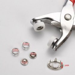 Supplied with 200 sets of snap fasteners in 10 colors, a pair of snap fastener pliers and a fastener installation tool.