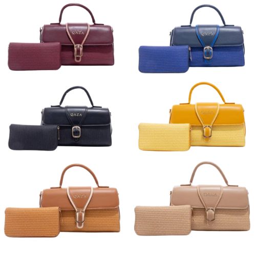 - Qaza brand women’s handbag set sold in gift sets including a shoulder bag and a matching clutch.