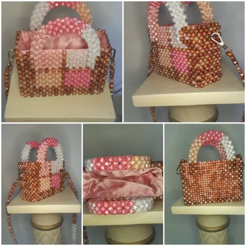 Caractéristiques : sac en perles carrées « sugar beads » de taille 8 en matière plastique et résine.