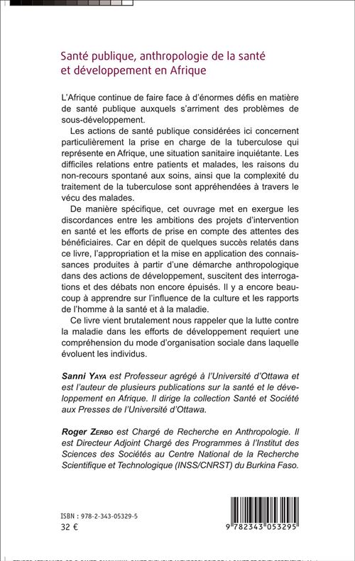 - Les actions de santé publique étudiées dans cet ouvrage concernent la prise en charge de la tuberculose en Afrique. Les difficiles relations entre soignants et malades, les raisons du non-recours spontané aux soins, ainsi que la complexité du traitement sont appréhendées à travers le vécu des malades. En dépit des quelques succès, les auteurs constatent les discordances. Ce livre vient rappeler que la lutte contre la maladie requiert une compréhension du mode d’organisation sociale dans laquelle évoluent les individus.