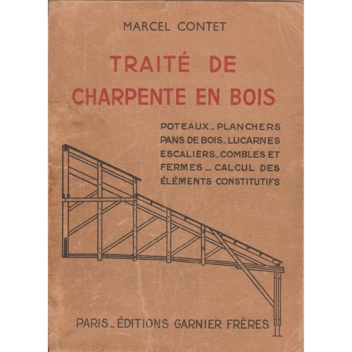 Marcel Contet traité de charpente en bois : Poteaux, planchers, pans de bois, lucarnes, escaliers, combles et fermes.Il inclut le calcul des éléments constitutifs, une partie essentielle pour le dimensionnement des structures.