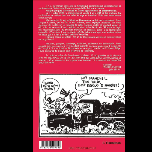 - Le 14 juillet 1989, la Répulique commémorait le Bicentenaire de la Révolution française. Jean-Jacques Lubrina nous explique ici pourquoi ce ne fut pas convaincant. En nous montrant de l’intérieur les rouages de cette machine molle et pourtant agitée, il décrit le microcosme d’une comédie humaine ou les Droits de l’Homme ne résistent guère à la technocratie culturelle. C’est alors le spectacle d’une véritable guérilla balzacienne auquel nous assistons, dans un décor qui n’a rien à envier à Versailles.