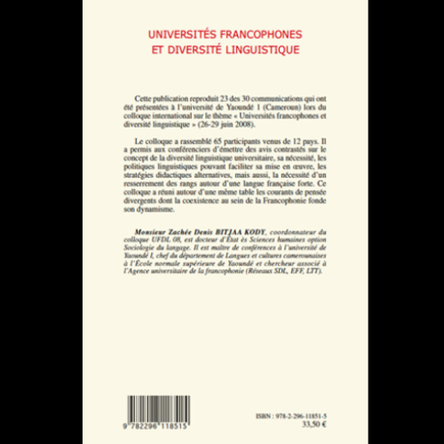 - Cette publication reproduit 23 des 30 communications qui ont été présentées à l’université de Yaoundé 1 (Cameroun) lors du colloque international sur le thème « Universités francophones et diversité linguistique » (26-29 juin 2008). Il a permis aux conférenciers d’émettre des avis contrastés sur le concept de la diversité linguistique universitaire, sa nécessité, les politiques linguistiques pouvant faciliter sa mise en œuvre, les stratégies didactiques alternatives, mais aussi, la nécessité d’un resserrement des rangs autour d’une langue française forte.