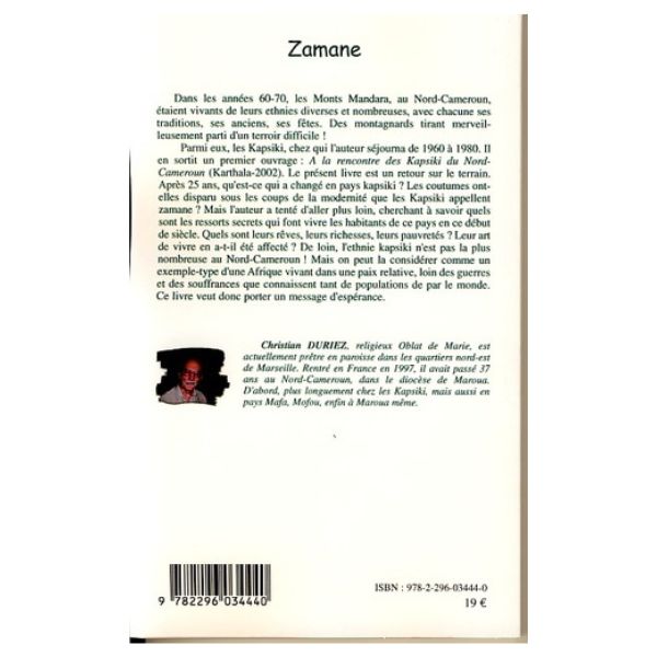 - Dans les années 60-70, les Monts Mandara, au Nord-Cameroun, étaient vivants de leurs ethnies diverses et nombreuses. Parmi elles, les Kapsiki, chez qui l’auteur a séjourné de 1960 à 1980. Ce livre est un retour sur le terrain. Après 25 ans, qu’est-ce qui a changé en pays kapsiki ? Les coutumes ont-elles disparu sous les coups de la modernité que les Kapsiki appellent zamane ? Quels sont les ressorts secrets qui font vivre les habitants de ce pays en début de siècle ? Quels sont leurs rêves, leurs richesses, leurs pauvretés?